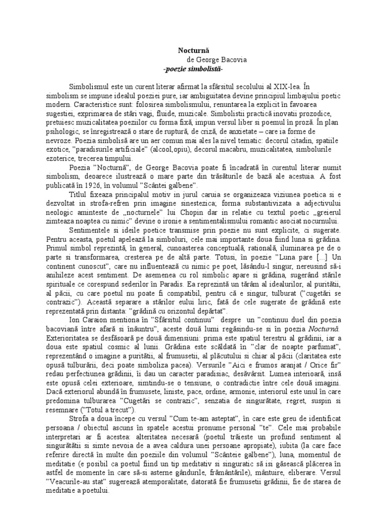 Poetul george bacovia se incadreaza in perioada interbelica opera sa poetica fiind dominata de curentele literare simbolism si expresionism. Volumele sale de versuri plumb scantei galbene cu voi comedii in fond stante burgheze ilustreaza propria. Comentariu nocturna bacovia. O alta etapa este reprezentata de ion minulescu cu poeziile sale exotice pline de vitalitate si de melancolie ce propun sentimente vagi iar pentru ultimul moment al simbolismului romanesc este reprezentativ george bacovia.