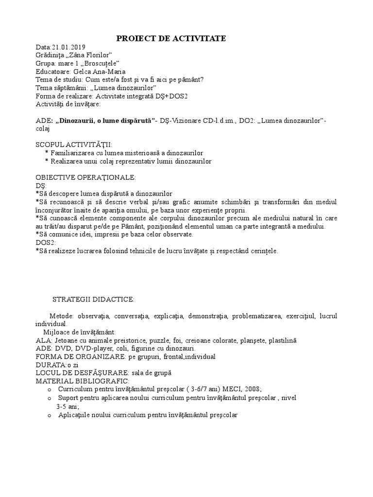 Proiect De Activitate Dinozauri 2019