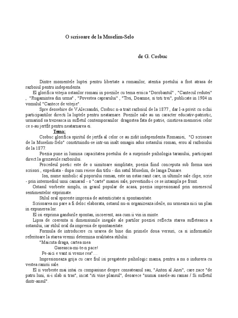 O Scrisoare De La Muselim Selo De George Cosbuc Comentariu Anideșcoală Ro