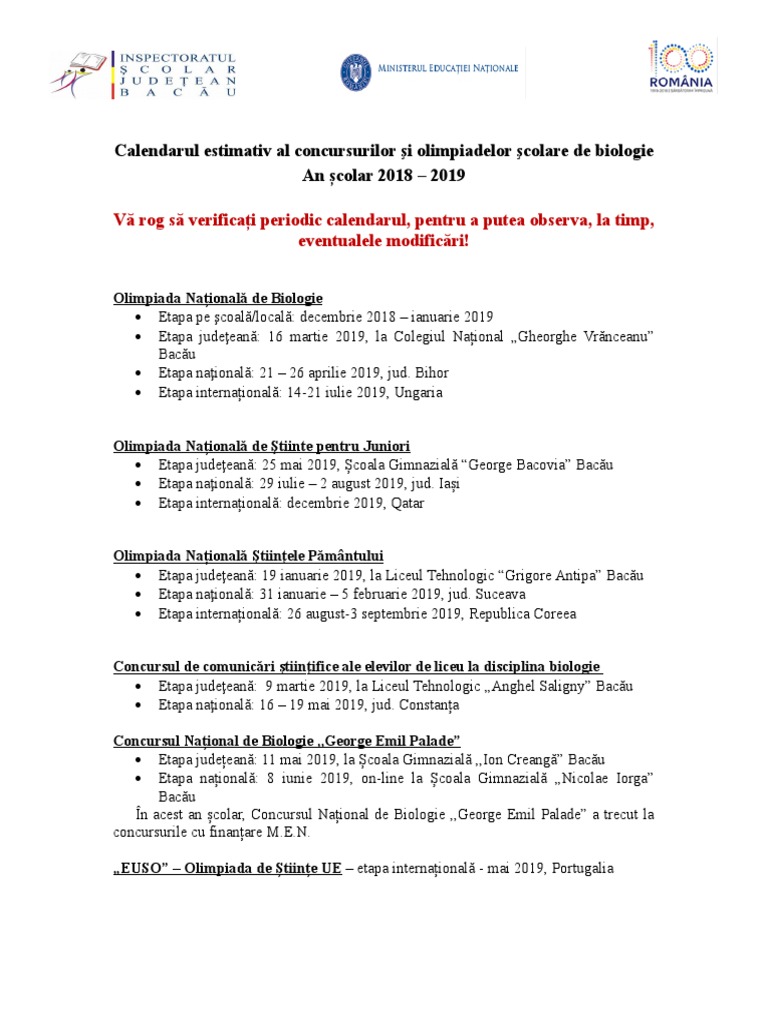 Calendarul Concursurilor Si Olimpiadelor Scolare 2018 2019