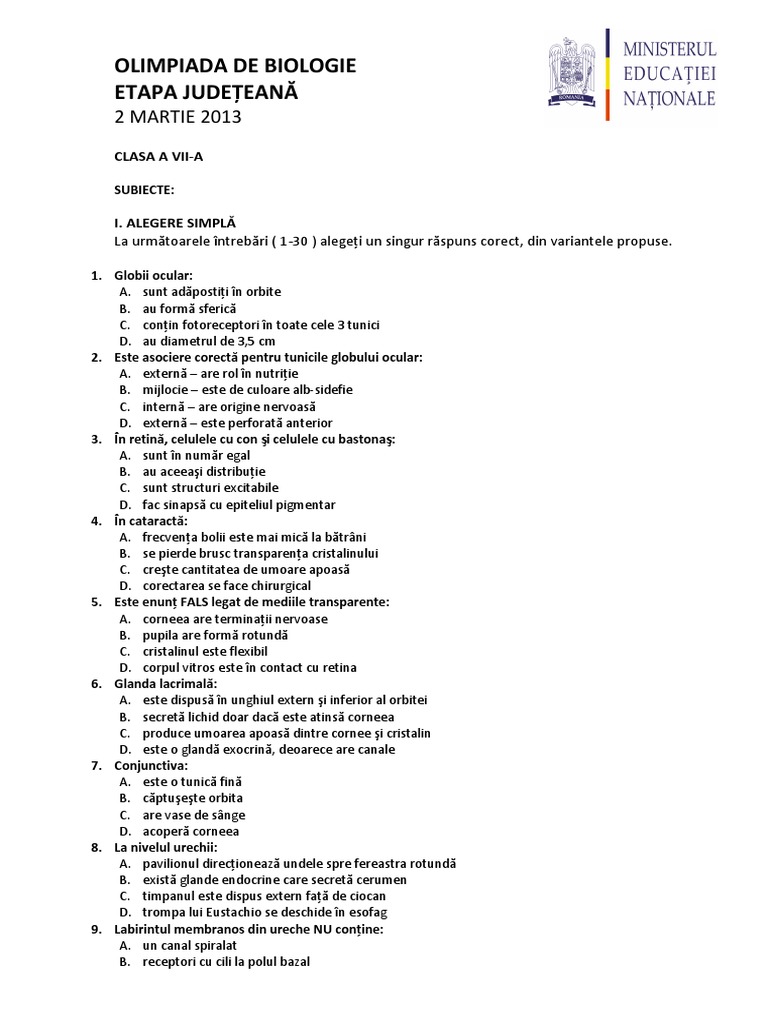 Olimpiada Judeteana De Biologie Clasa A 7 A Subiect Barem