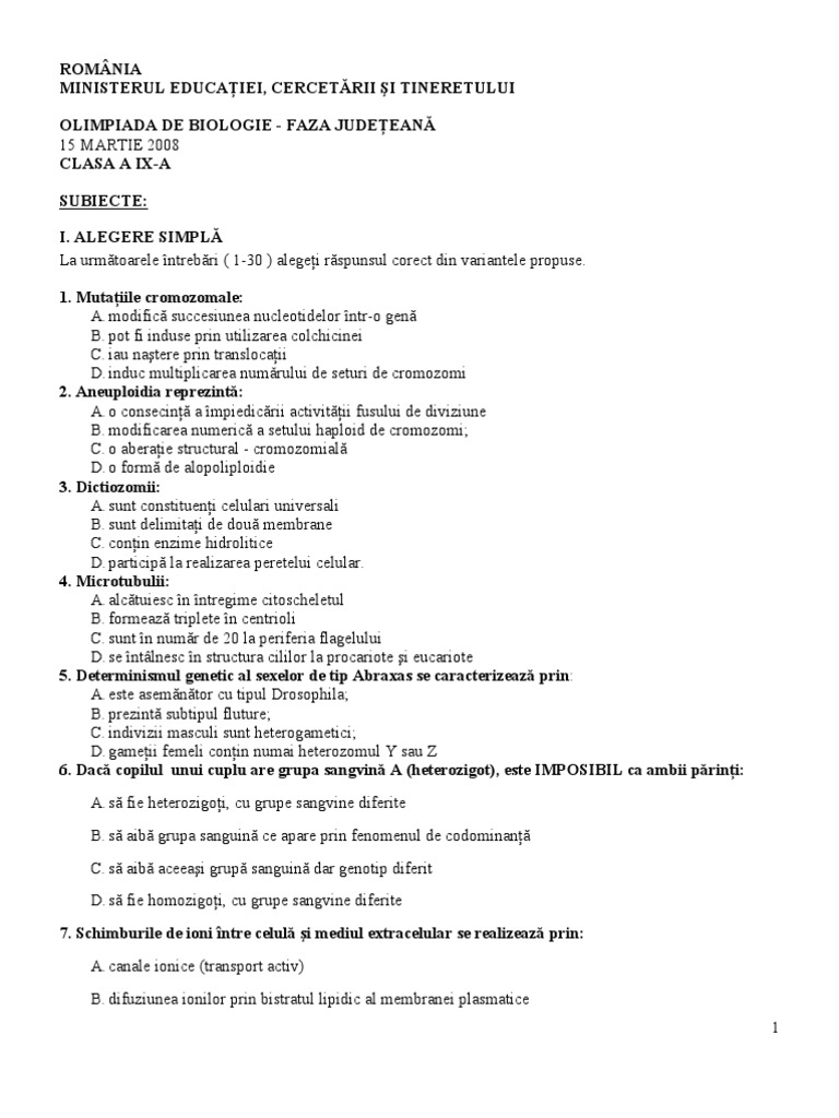 Doc Olimpiada De Biologie Faza Locala 17 Ianuarie 2009 Clasa A Ix A Adelina Mariia Academia Edu