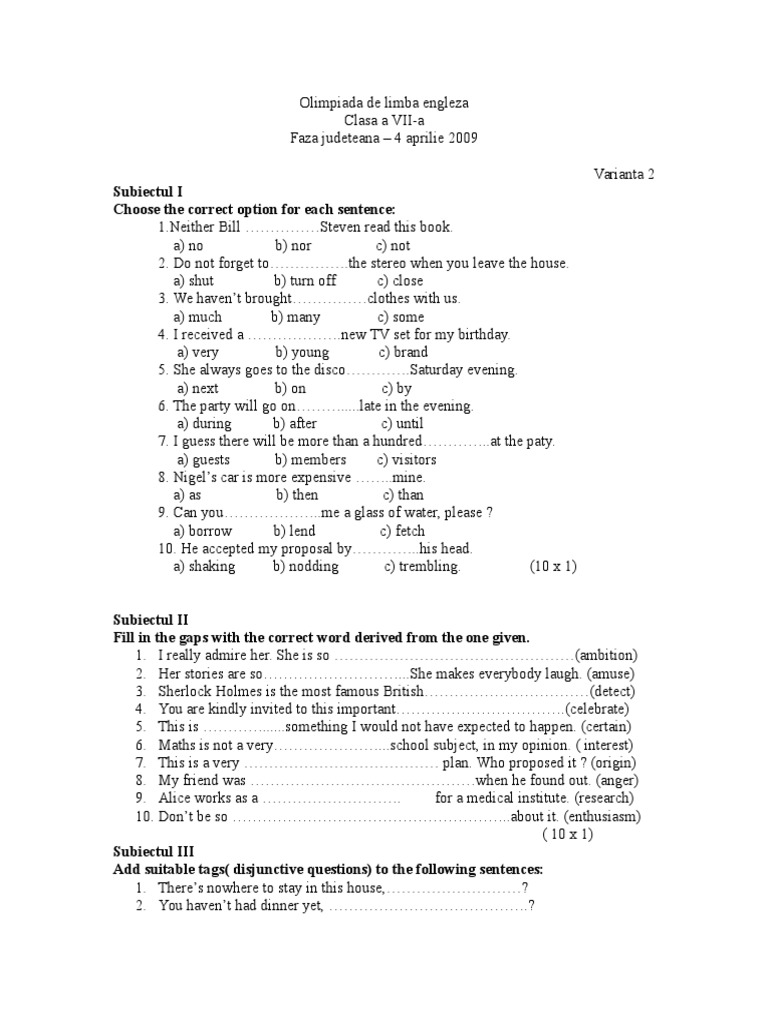 Olimpiada De Engleza Clasa A 7 A Faza Locala 16 Feb 2013 Varianta 1 E Urgent Brainly Ro
