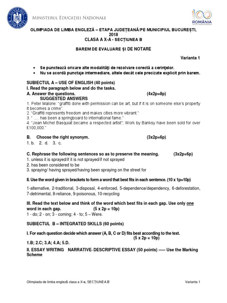 Olimpiada Judeteana De Limba Engleza 2018 Clasa A X A Ssectiunea B Barem Vocabulary Essays