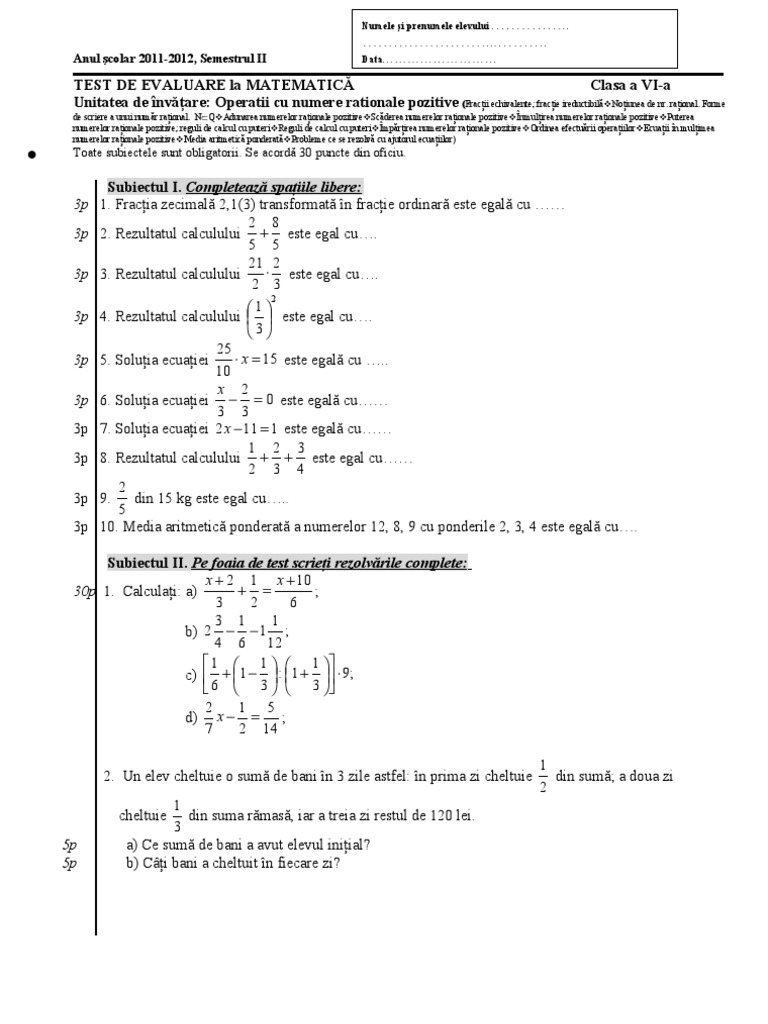 Clasa A Vi A Test Operaţii Cu Nr Raţionale Pozitive Model 1 Partea A V A Youtube
