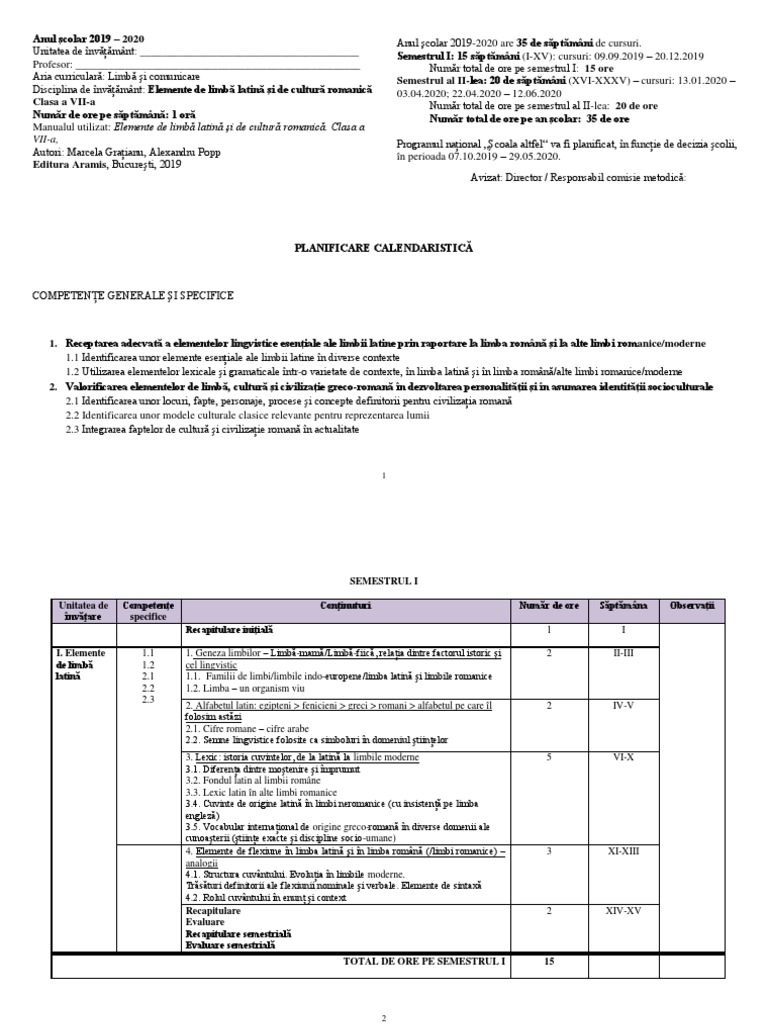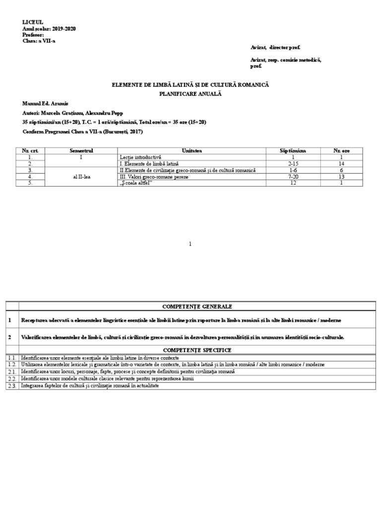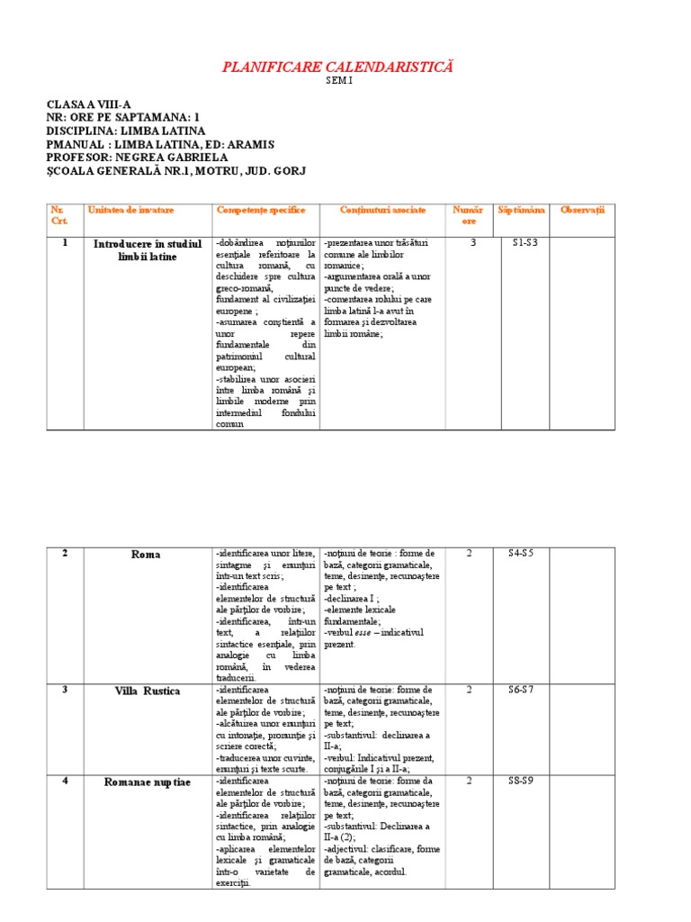 Planificare Elemente De Limbă Latină și De Cultură Romanică Docx