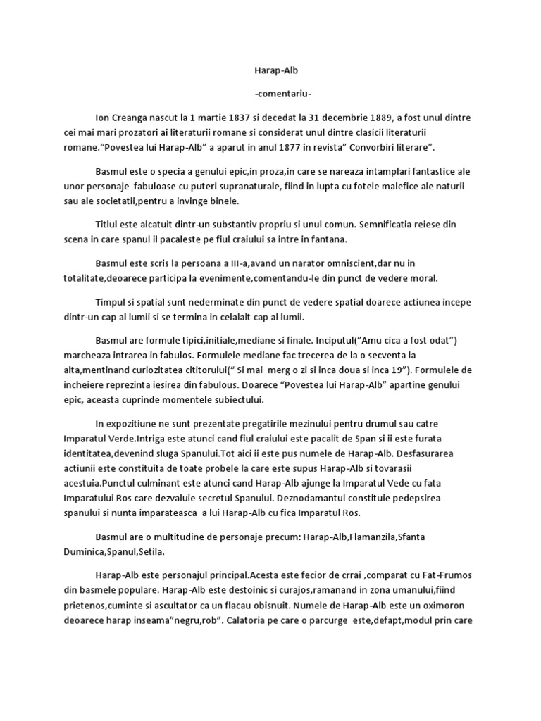 Povestea Lui Harap Alb De Ion Creangă Comentariu G B