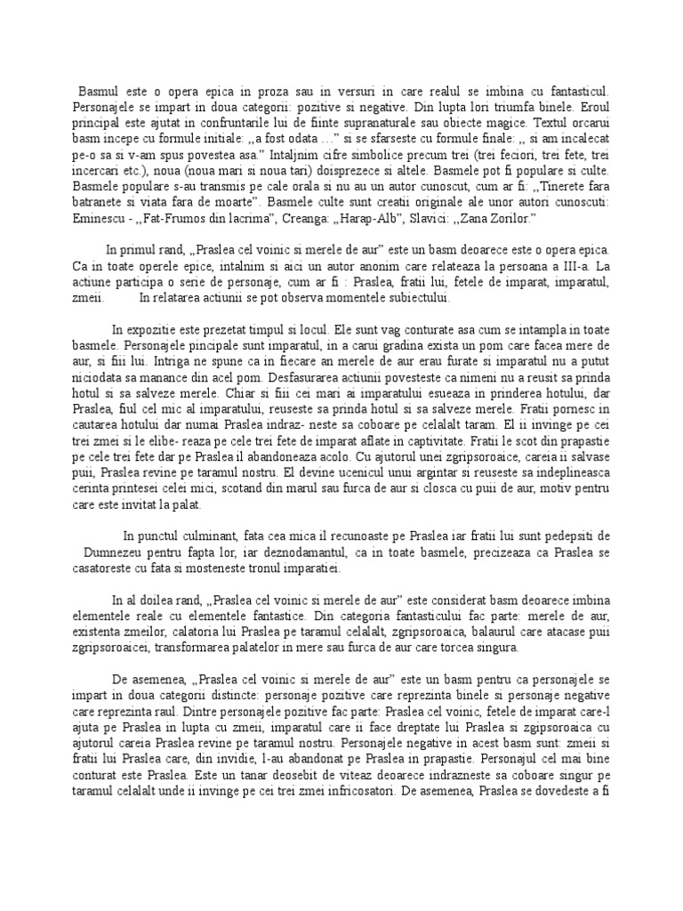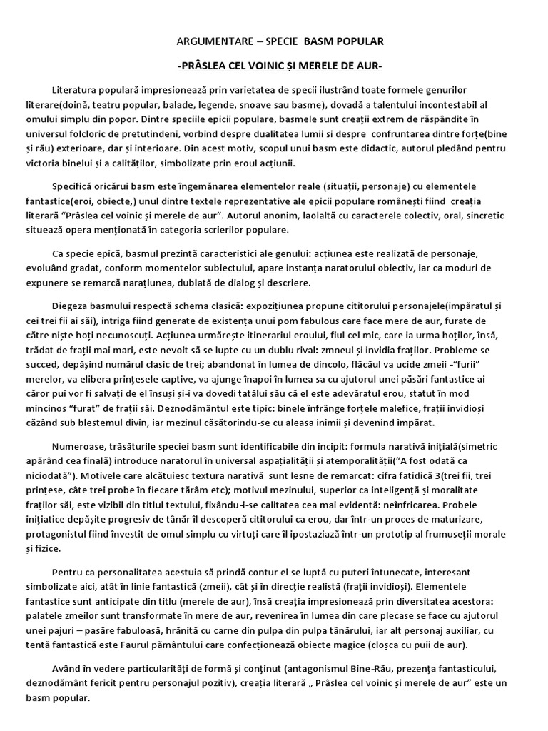 Argumentare Specie Basm Popular Praslea Si Merele De Aur Docx