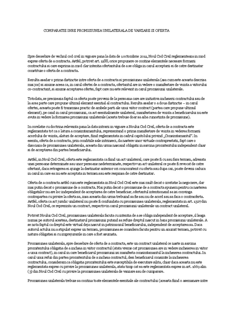 Comparatie Inre Promisiunea Unilaterala De Vanzare Si Oferta