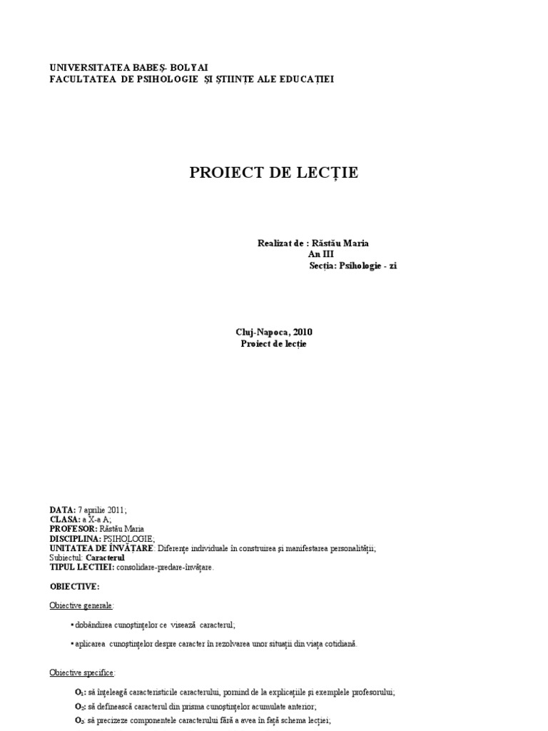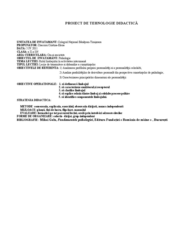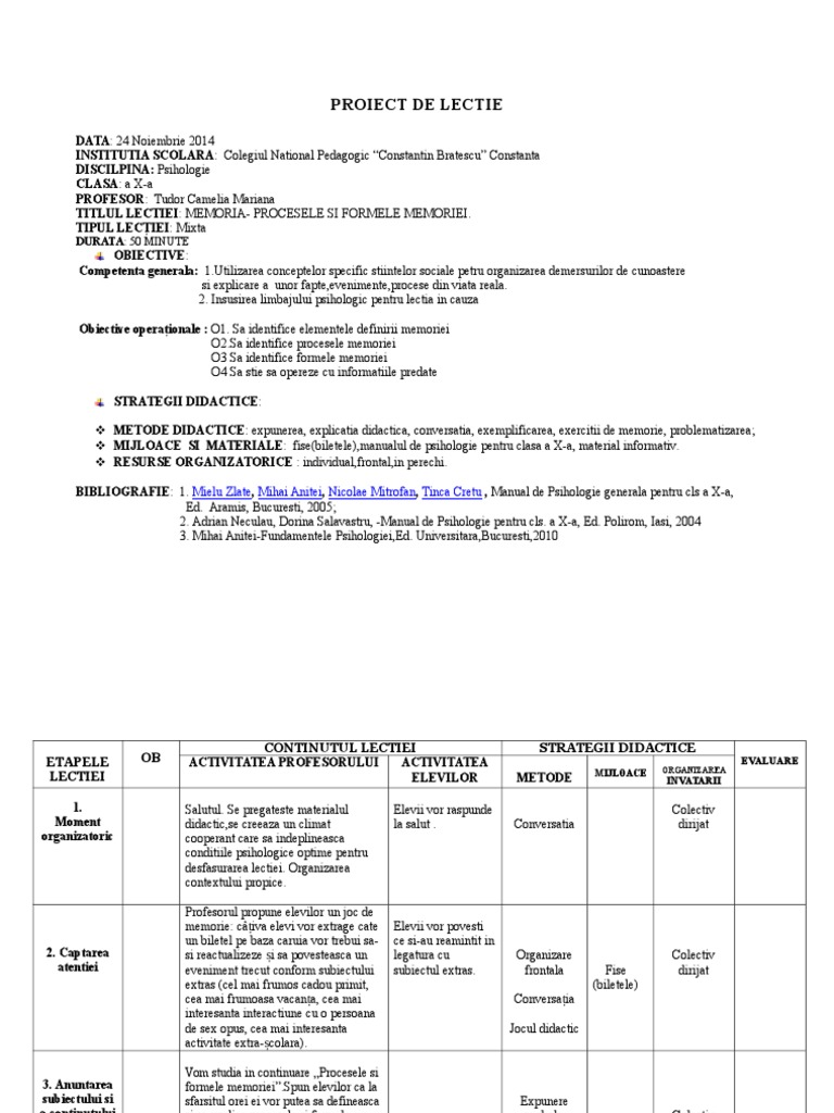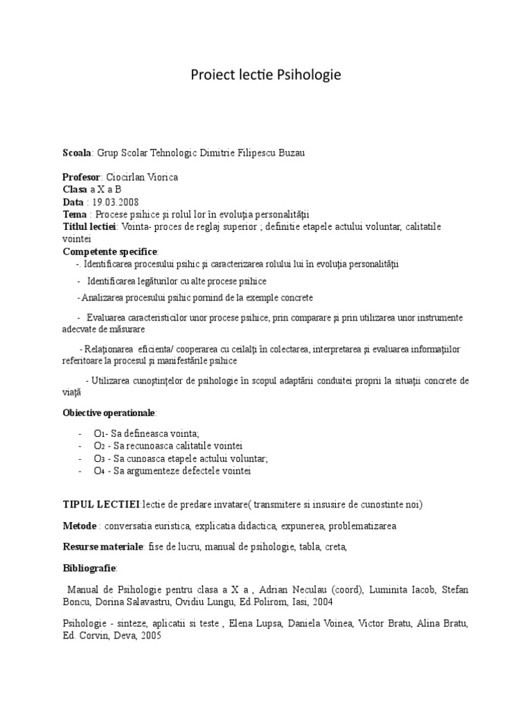 Proiect De Lecţie Good Notes For Psychology Students Studocu