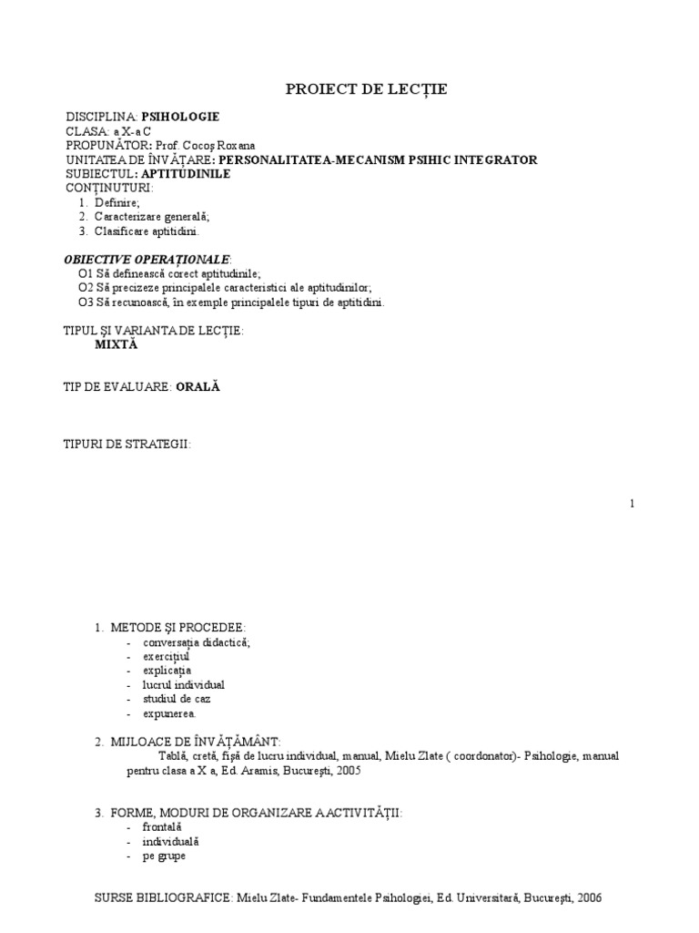 Proiect Proiect De Lectie Aptitudinile Psihologie 170957