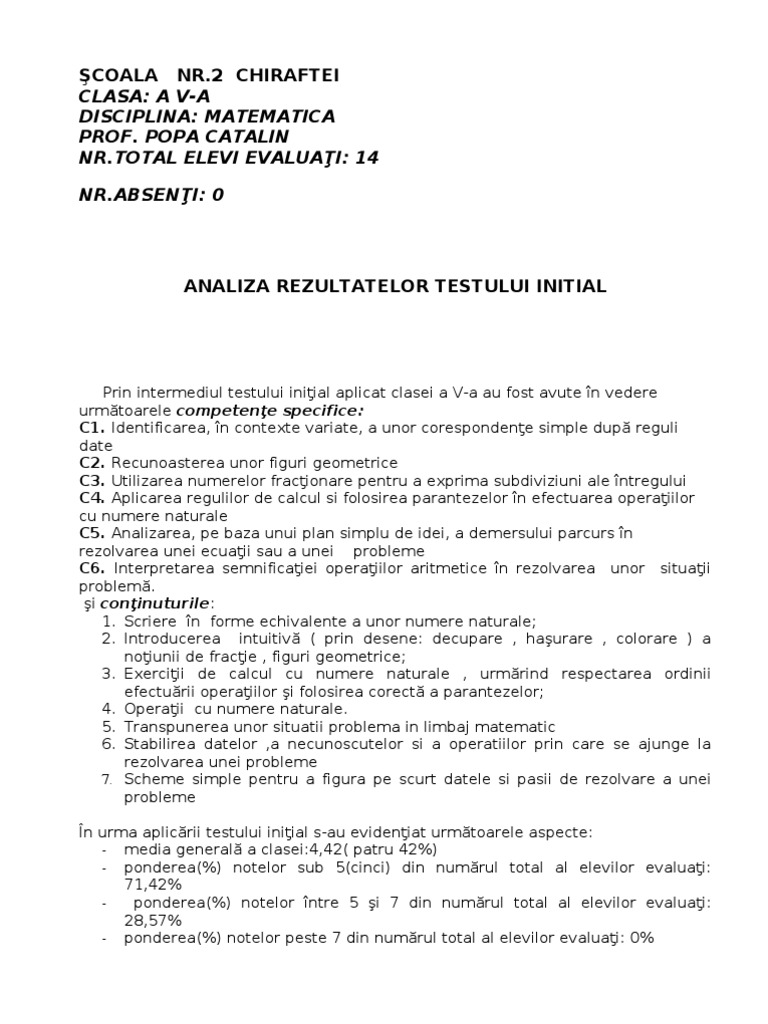 Raport Teste Initiale Matematica