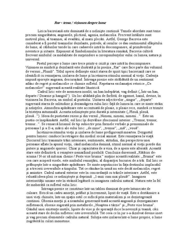 Tema Si Viziunea Despre Lume Intr Un Text Poetic Studiat Care Apartine Lui George Bacovia Rar