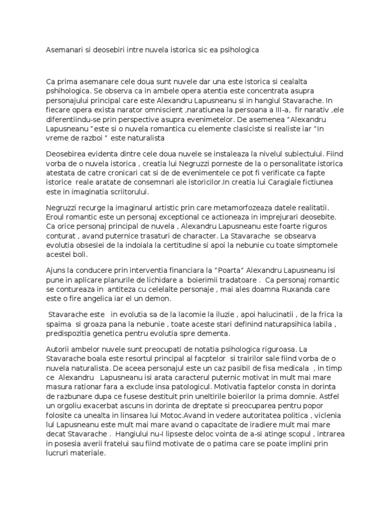 Asemanari Si Deosebiri Intre Nuvela Istorica Sic Ea Psihologica