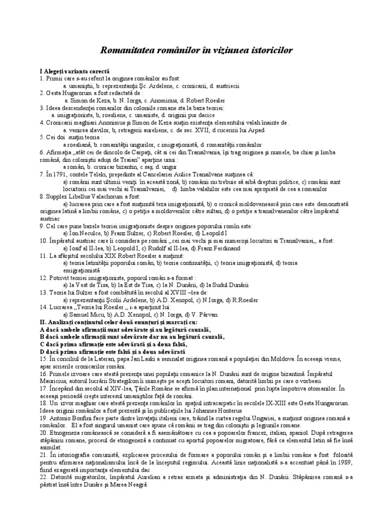 9 Test Cls 12 Romanitatea Romanilor In Viziunea Istoricilor