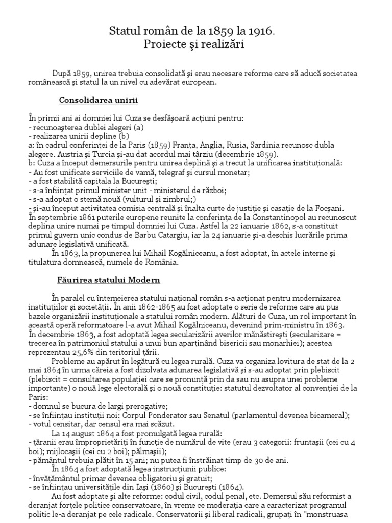 Statul Roman De La 1859 La 1916