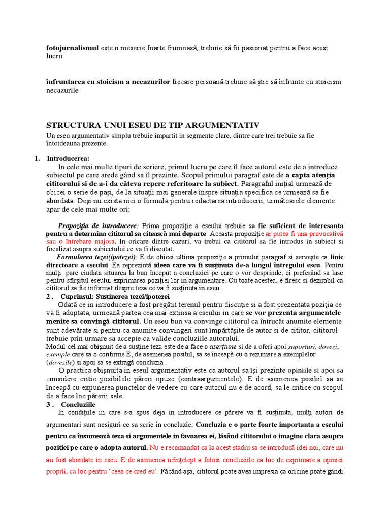 Structura Unui Eseu De Tip Argumentativ